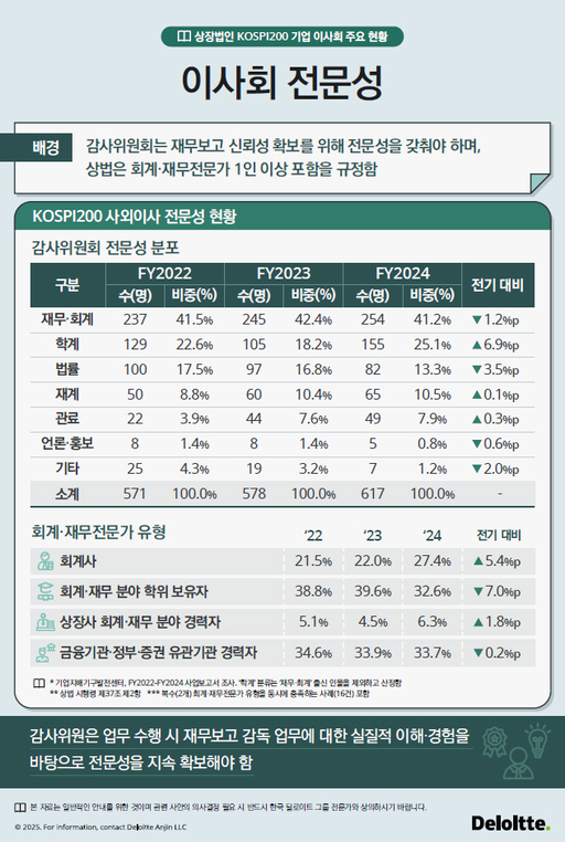 한국 딜로이트 그룹 기업지배기구발전센터는 상장법인 KOSPI200 기업 이사회 현황을 분석한 '기업지배기구 데이터 동향 제6호'를 14일 발간했다.