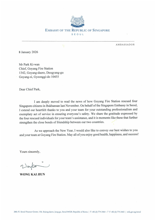 이에 감동한 주한 싱가포르 대사관은 박기완 고양소방서장 앞으로 공식 감사 서한을 보내왔다. 웡 카이 쥰(Wong Kai Jiun) 대사는 "진심 어린 감사와 함께, 고양소방서 대원들의 탁월한 전문성과 모범적인 헌신에 깊은 감동을 받았다"며 "이번 구조 활동이 양국 간의 우호와 신뢰를 더욱 굳건히 하는 계기가 될 것"이라고 전했다.