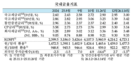 물가 지표는 당장 '인하 신호'로 읽히기 어렵다는 평가도 덧붙였다. 한은은 12월 소비자물가 상승률이 2.3%로 소폭 낮아졌지만 근원물가(식료품·에너지 제외)는 2.0%로 전월 수준을 유지했고, 단기 기대인플레이션율도 2.6%로 전월과 같다고 밝혔다. 물가가 점차 2% 수준으로 낮아질 전망이지만 높아진 환율이 상방 리스크로 작용할 수 있다는 점을 분명히 했다.