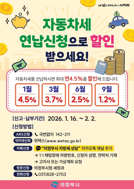 의정부시(시장 김동근)는 자동차세를 1월에 연납으로 납부하면 연간 세액의 최대 4.5%를 공제받을 수 있다고 밝혔다.