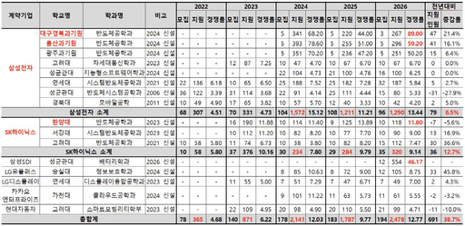 기업별로 보면 삼성전자 계약학과 전체 지원자수는 1290명으로 전년 대비 6.5% 증가했다. SK하이닉스 계약학과 지원자수는 320명으로 전년 대비 12.7% 늘었다.