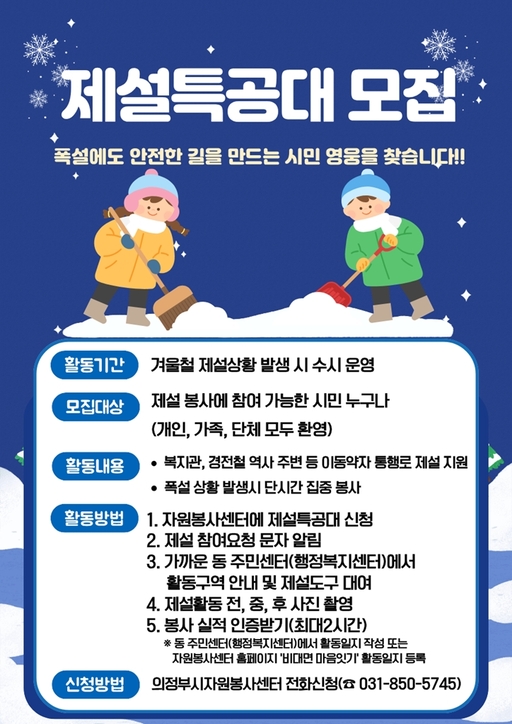 의정부시(시장 김동근)는 겨울철 폭설로 인한 시민 불편을 최소화하고 안전한 보행환경을 조성하기 위해 '제설특공대'를 모집한다.
