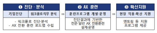 지원 프로그램은 '진단·훈련·확산'의 3단계 패키지로 운영된다. 1단계에서는 전문가가 기업 현장을 방문해 AI 도입 준비 수준과 업무 병목을 진단하고, 기업 맞춤형 AI 훈련 로드맵을 수립한다. 2단계에서는 대표이사(CEO)를 대상으로 한 인사이트 교육(일반 AX)과 실무자 중심의 문제 해결형 교육(전문 AX)이 병행된다. 실무 훈련은 최소 18시간 이상 실습 위주로 구성돼, 현장 적용 가능성을 높인다. 마지막 3단계에서는 훈련 종료 이후에도 전문가가 현장을 밀착 지원하며 실제 업무 과정에서 발생하는 문제 해결을 돕는다. 아울러 우수사례 공유회를 통해 AI 전환 성과를 확산시킨다.