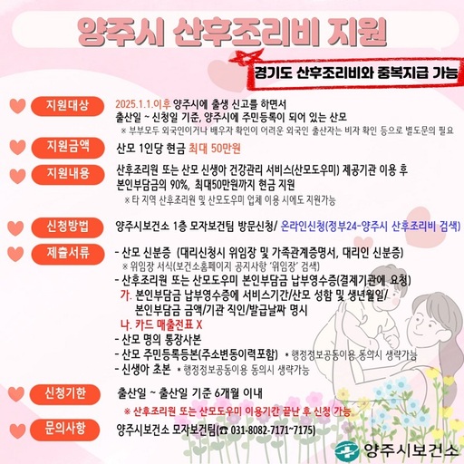 양주시보건소가 2025년 1월 1일 출생아부터 관내 출산가정을 대상으로 '양주시 산후조리비 지원사업'을 시행하고 있다.