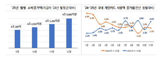 지난해 9~11월 국내 9개 카드사의 개인카드 사용액 통계를 보면 월별 카드 소비액의 전년 동월 대비 증가율은 각각 4.8%, 2.3%, 4.5%였다. 2024년 9~11월의 전년 동기 대비 증가율인 1.2%, 2.8%, 2.7%보다 전반적으로 높은 수준을 보였다.