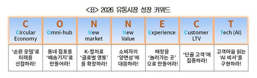 대한상공회의소는 미래 유통산업의 핵심 성장 키워드로 'C.O.N.N.E.C.T'를 선정하며 "앞으로의 경쟁력은 고객과 매장, 인공지능(AI)과 경험을 얼마나 정교하게 연결하느냐에 달려 있다"고 밝혔다.