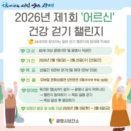 광명시(시장 박승원)는 2월부터 모바일 걷기 플랫폼 '워크온(WalkOn)'을 활용한 걷기 챌린지 운영 방식을 개편하고, 65세 이상 시민을 대상으로 한 '어르신 걷기 챌린지'를 별도로 운영한다고 21일 밝혔다.
