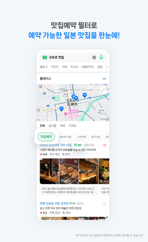 이용자가 '도쿄 맛집' '삿포로 맛집' '오사카 맛집' 등 일본 주요 도시의 맛집을 검색하면 전체 음식점 목록이 노출되며, 리스트 좌측 상단의 '맛집 예약' 필터를 클릭할 경우 예약 가능한 식당만 별도로 제공하는 방식이다.