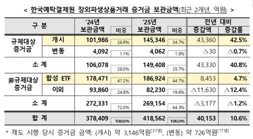 규제대상에 해당하지 않는 비규제대상 증거금은 26조9154억원으로 전년 말 27조2331억원보다 소폭 감소했다. 다만 장외 스왑거래를 활용해 지수를 복제·추종하는 합성 ETF 관련 증거금은 18조6924억원으로 전년 대비 8453억원 늘었다. 합성 ETF를 제외한 기타 비규제대상 증거금은 8조2230억원 수준으로 줄었다.