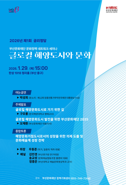 재단은 오는 29일 오후 3시 부산 중구 B-Culture Plaza 한성1918에서 '2026 제1회 궁리정담'을 주제로 '글로컬 해양도시와 문화' 행사를 개최한다고 밝혔다.