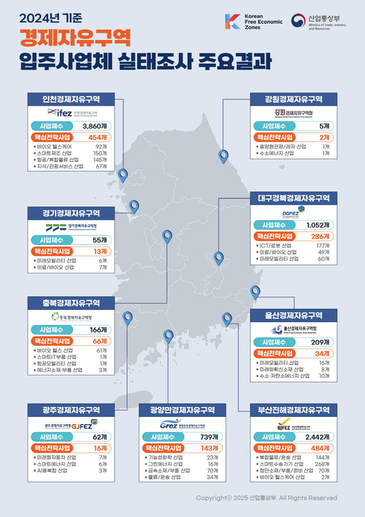 조사 결과 입주 사업체 수는 2442개사로 전년 대비 7.8% 늘어 5년 연속 성장세를 이어갔다. 투자액은 7108억원으로 전년 대비 10.2% 증가했다.