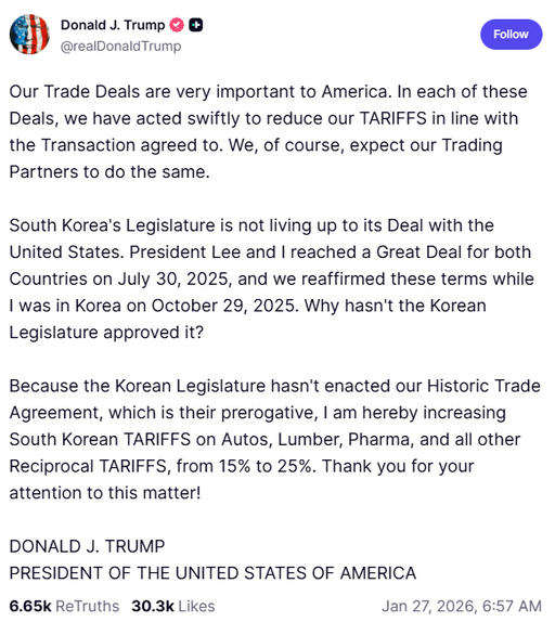 실제 트럼프는 26일(현지시간) 자신의 사회관계망 서비스(SNS)를 통해 "한국 국회가 미국과의 무역 협정을 이행하고 있지 않다"라며 "자동차·목재·의약품을 비롯한 주요 품목에 대한 관세를 15%에서 25%로 인상하겠다"라고 언급했다. 무역 협상을 마친 국가 가운데 관세가 재인상된 것은 한국이 처음이다. 유럽연합(EU)을 비롯한 일부 국가도 관련 입법이 지연되고 있는 만큼, 트럼프가 잇달아 관세를 인상해 빠른 입법을 압박할 가능성도 존재한다.