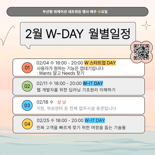 2월 W-DAY는 부산 아기유니콘 기업이자 IT 프로젝트 인재 매칭·개발·관리 플랫폼 '그릿지'를 운영하는 소프트스퀘어드와 공동 기획해 스타트업 및 IT 실무 역량 강화 중심의 월별 프로그램으로 구성했다.