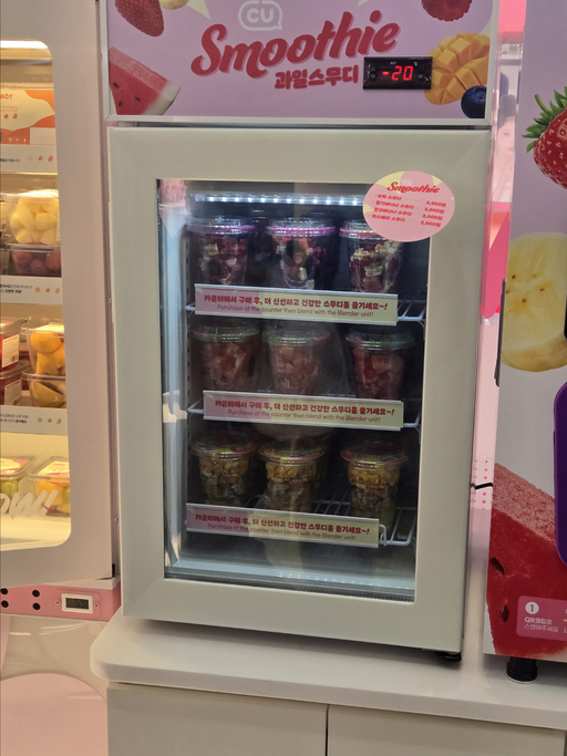 디저트와 함께 즐길 수 있는 음료 라인업도 탄탄하다. CU는 자체 즉석 원두커피 브랜드 '겟(get)커피'의 원두를 한국인이 선호하는 고소한 맛으로 전면 리뉴얼했다. 리뉴얼 이후 커피 매출이 20% 이상 증가했으며, 자체 조사 결과 커피 구매 고객의 약 58%가 디저트를 함께 구매하는 것으로 나타났다. 성수점은 이러한 페어링 수요를 겨냥해 커피와 디저트의 연관 진열을 강화했다.이 밖에도 냉동 과일을 즉석에서 갈아주는 '리얼 스무디 기계'와 1인 가구를 겨냥한 소용량 컵과일 자판기 등 차별화된 기기들을 도입해 고객 선택의 폭을 넓혔다.