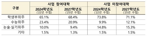 실제로 사업 참여 대학의 학생부·수능 위주 전형 비율은 2025학년도 89.0%, 2026학년도 88.8%, 2027학년도 89.3%로 높은 수준을 유지하고 있다. 특히 수도권 대학은 2026~2028학년도에 수능 위주 전형을 30% 이상 운영해야 하며, 일부 대학은 40% 이상을 충족해야 사업에 참여할 수 있다.