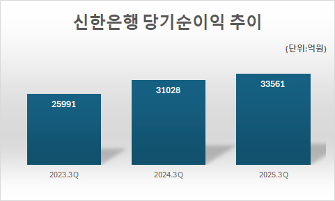 실적도 견조한 성장세다. 정 행장이 취임한 지난 2023년 신한은행의 3분기 누적 당기순이익은 2조5991억원으로 전년 동기대비 0.3% 증가했다. 이후 정 행장은 꾸준히 실적을 높였다. 2024년 3분기 당기순이익은 3조1028억원에서 지난해 당기순이익은 3조3561억원으로 올랐다.