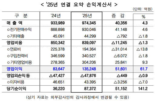 한국전력공사는 2025년 결산(잠정) 결과 연결기준 매출 97조4345억원, 영업이익 13조5248억원을 기록했다고 26일 밝혔다. 영업이익은 전년 대비 5조1601억원(61.7%) 증가했다. 당기순이익은 8조7372억원으로 141.2% 늘었다.