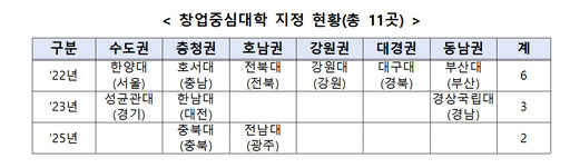 앞서 중기부는 한양대·성균관대(수도권), 호서대·한남대·충북대(충청권), 전북대·전남대(호남권), 강원대(강원권), 대구대(대경권), 부산대·경상국립대(경상권)를 권역별 창업중심대학으로 선정한 바 있다.