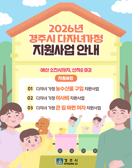 경주시가 다자녀 가정의 경제적 부담을 덜고 안정적인 정주 여건을 뒷받침하기 위해 '2026년 다자녀 가정 지원사업'을 오는 3월부터 본격 시행한다.