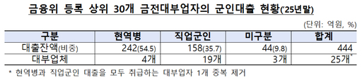 금융감독원은 금융위원회에 등록된 상위 30개 금전대부업자를 대상으로 군 장병 대상 대출 영업 실태를 조사한 결과, 지난해 말 기준 군 장병 대상 대출 잔액이 총 444억원으로 집계됐다고 8일 밝혔다.