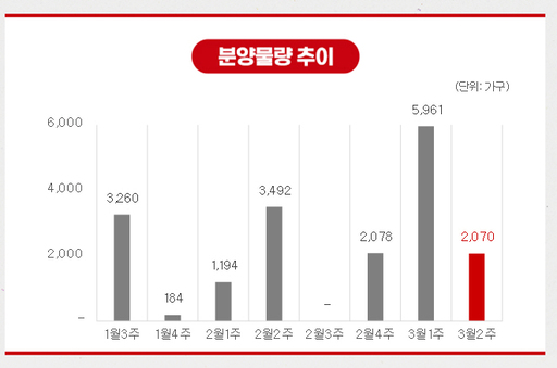 8일 부동산R114에 따르면 3월 둘째 주에는 전국 3개 단지 총 2070가구가 공급된다. 이 가운데 일반분양 물량은 1279가구다.