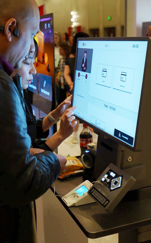 올해 전시에는 점자기기 전문기업 닷(Dot)과 공동 개발한 키오스크 신제품을 처음으로 선보였다. 장애 고객들도 편리하게 사용할 수 있도록 점자패널, 수어안내, 스크린리더 등 다양한 접근성 기술을 통합 적용한 제품이다. 휠체어 사용자나 키가 작은 고객은 버튼을 눌러 키오스크 스탠드의 높낮이를 조절할 수 있다.