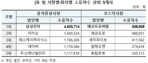 시장 전체를 관통하는 특징은 삼성전자 중심의 주주 쏠림이다. 삼성전자 소유자는 460만5714명으로 단일 종목 기준 압도적 1위를 기록했다. 뒤이어 카카오(160만524명), SK하이닉스(118만6306명), 두산에너빌리티(111만7819명) 등과 비교해도 격차가 크다. 개인 투자자 저변이 확대되는 가운데에서도 투자 관심이 특정 대형주에 집중되는 구조가 이어지고 있는 모습이다.
