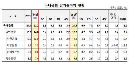 19일 금융감독원이 발표한 '2025년 국내은행 영업실적(잠정)' 자료에 따르면 지난 2025년 국내은행의 총 당기순이익은 총 24조1000억원을 기록했다. 일반은행(시중·지방·인터넷)은 전년 대비 1조4000억원 늘어난 16조2000억원을, 특수은행은 전년 대비 4000억원 늘어난 7조8000억원의 순이익을 기록했다.