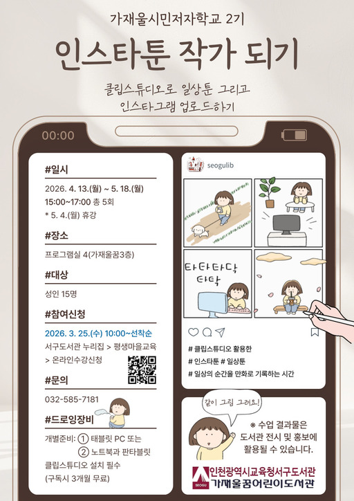 인천광역시교육청서구도서관은 지역 주민의 창작 활동을 지원하기 위해, 25일부터 가재울 시민저자학교 2기 프로그램인 '인스타툰 작가되기' 참여자를 모집한다.