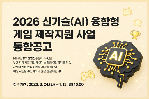 부산시와 부산정보산업진흥원은 '2026 신기술 융합형 게임 제작 지원 사업' 참가 기업을 4월 13일 오전 10시까지 모집한다고 밝혔다. 부산에 본사 또는 지사를 둔 게임 기업이 대상이며 본사 이전을 확약한 기업도 신청할 수 있다.