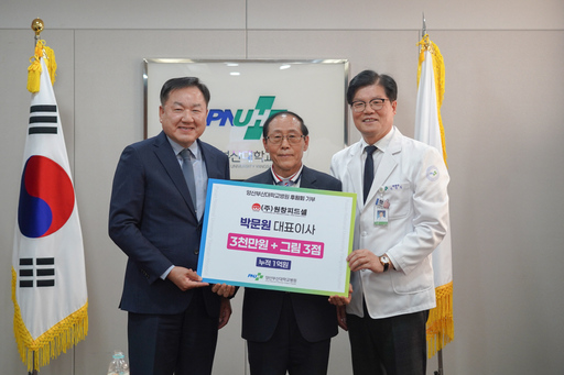 양산부산대병원은 지난 25일 조용국 코렌스 회장과 박문원 원창피드셀 대표이사가 각각 1억원과 3000만원의 발전기금을 냈다고 밝혔다. 이번 기부로 두 사람의 누적 기부액은 각각 1억5000만원, 1억원에 이른다.