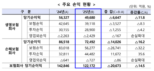 30일 금융감독원이 발표한 '2025년 보험회사 경영실적(잠정)'에 따르면 지난해 보험사 당기순이익은 12조2172억원으로 전년보다 2조673억원(14.5%) 감소했다. 생명보험사는 4조9680억원으로 6647억원(11.8%), 손해보험사는 7조2492억원으로 1조4026억원(16.2%) 각각 줄었다.