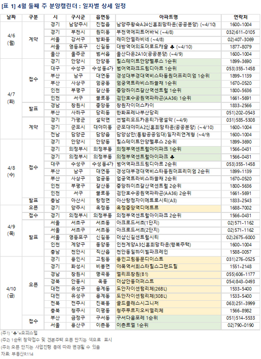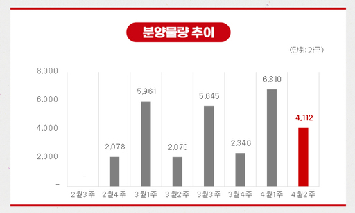 5일 부동산R114에 따르면 4월 둘째주에는 전국 10개 단지 총 4112가구가 분양을 시작한다. 이 가운데 일반분양 물량은 2597가구다.