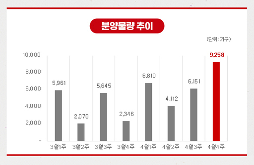 19일 부동산R114에 따르면 4월 넷째주에는 전국 11개 단지 총 9258가구가 분양을 시작한다. 이 중 일반분양 물량은 8432가구다.