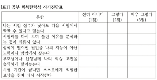 공부 회복탄력성이란 시련을 딛고 다시 일어서는 마음의 근력을 의미한다. 전략적인 기말 대비에 앞서 학생 스스로 자신의 심리적 근육 상태를 점검해 보는 과정이 반드시 선행돼야 한다.