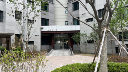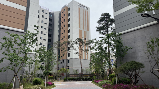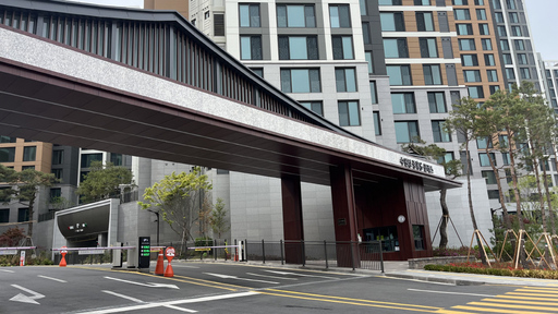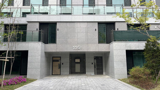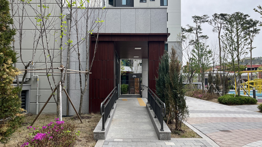 단지 내부 건축에서도 전통적 요소가 곳곳에서 드러난다. 동 입구는 회색 석재로 단정하게 틀을 잡은 구조 안에 짙은 갈색 패널과 기둥을 덧댄 형태다. 목재의 결을 살린 마감도 눈에 띈다. 갈색 프레임은 한옥 기둥이나 처마를 연상시킨다. 테라스 세대, 복층형 세대, 별도 출입구를 둔 저층부 등 다양한 주거 유형이 섞여 있어 마치 궁궐 앞에 마을을 이룬 듯한 풍경이다.