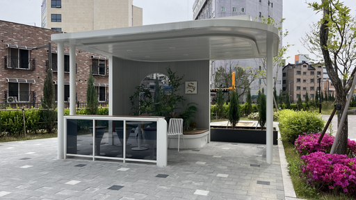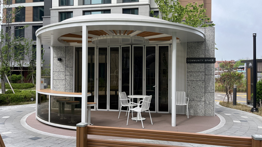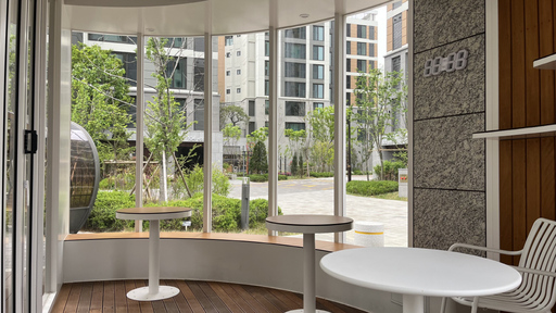 여유로운 시간을 보낼 수 있는 휴식 공간도 촘촘히 배치돼 있다. 원형 지붕 아래 마련된 소규모 쉼터는 테이블과 의자도 둥글게 디자인해 부드러운 곡선을 강조했다. 목재 데크와 석재기둥이 절제된 톤으로 사용되며 전체적으로 차분한 인상을 준다. 실내 공간에는 유리창으로 바깥 조경이 그대로 스며 들어 아늑한 분위기를 만든다.