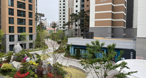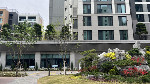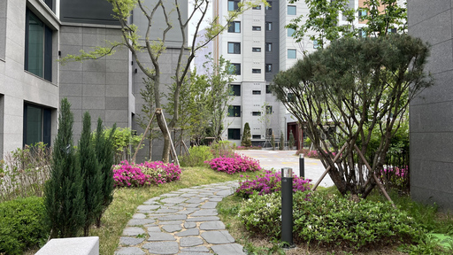 단지 중앙부의 석가산은 시선을 자연스럽게 끌어당기는 핵심 조경이다. 회색 암석과 알록달록한 꽃, 짙은 녹색 수목이 어우러져 계절감을 드러낸다. 바닥 포장도 눈에 띈다. 반듯한 아스팔트 대신 불규칙한 석재 패턴을 적용해 예스러운 정원 분위기를 살린다. 단지 전반의 은은한 조경과 맞물려 고풍스러움을 더한다.