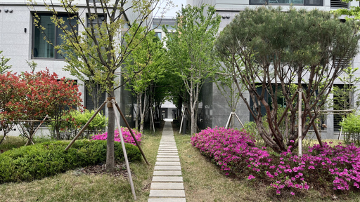 동 사이를 가로지르는 산책로는 마치 숨겨진 길처럼 길게 뻗어 있다. 일정 간격으로 디딤석이 놓여 있고 키를 낮춘 수목과 화단이 이어진다. 외부와는 은근히 차단된 채 좁은 길 안쪽으로 또 다른 풍경이 연출된다. 동화 속 세계로 걸어 들어가는 듯한 느낌도 준다.