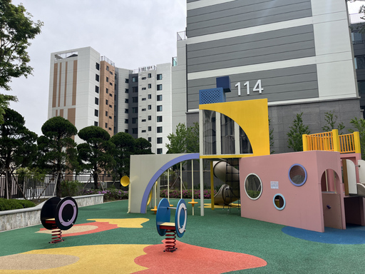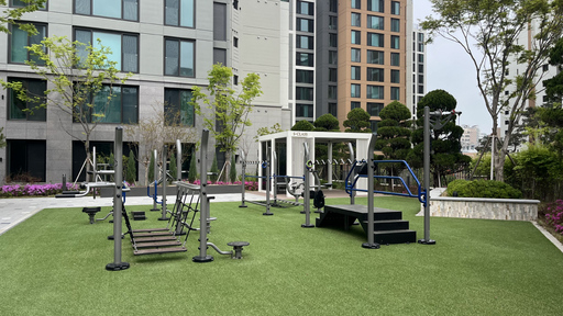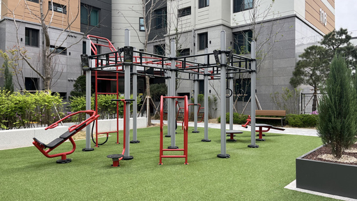 운동시설은 단지 곳곳에 분산 배치돼 접근성이 높다. 기구 종류도 유산소·근력·스트레칭까지 고르게 갖췄다. 일부 공간은 철봉·링·밧줄을 하나의 구조물로 묶어 활용도를 높였다. 규모는 크지 않지만 한번에 다양한 활동을 즐길 수 있는 알찬 구성이다.
