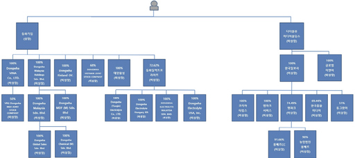 동화기업이 동화 VINA(100%), 동화 말레이시아(100%), 태양합성(100%), 동화일렉트로라이트(72.62%) 등을, 디더블유미디어홀딩스가 한국일보사(100%), 글로벌이앤비(100%) 등을 각각 지배하는 구조다.