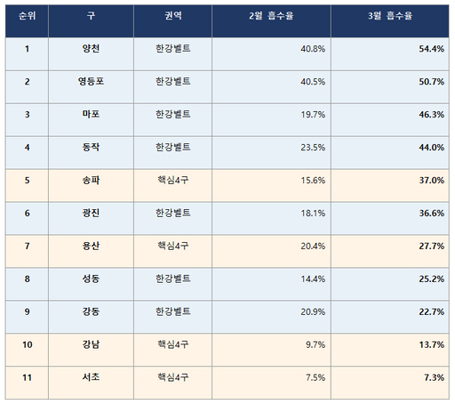 강남권은 고전을 면치 못했다. 강남구의 3월 흡수율은 13.7%에 머물렀고, 서초구는 7.3%로 분석 대상 11개 구 중 최하위를 기록했다. 특히 서초구는 2월(7.5%)보다도 흡수율이 하락해 매물이 갈수록 팔리지 않는 양상을 보였다.