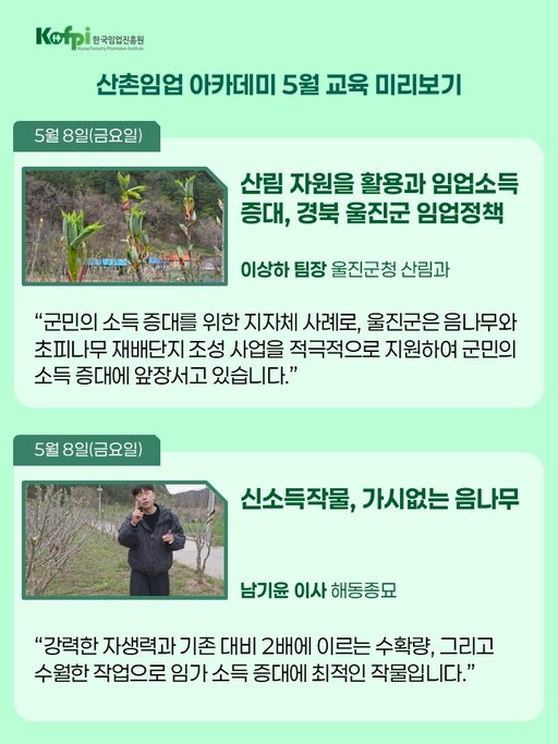 프로그램은 정책 안내와 현장 사례를 결합한 구조로 설계됐다. 울진군 산림소득 보조사업을 소개하고 가시 없는 음나무를 재배하는 임업인의 사례를 함께 다룬다. 이론 전달에 그치지 않고 실제 경험을 공유하는 방식으로 이해도를 높인다는 계획이다.