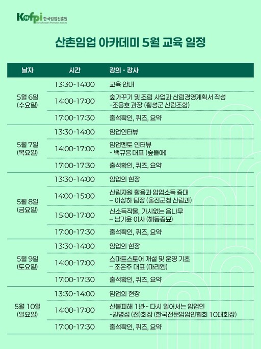 전체 일정 가운데 5월 8일 교육은 울진군을 중심으로 구성된다. 해당 회차는 실시간 촬영과 송출 방식으로 진행된다. 교육은 오후 1시 30분부터 4시간 동안 이어진다. 전국 임업 종사자와 귀산촌 준비자 등 약 100명이 참여할 것으로 예상된다. 울진군은 사전 협의와 현장 점검을 통해 강의 내용을 정비했다.