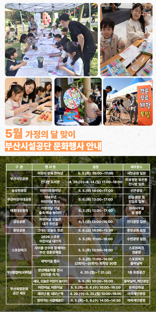이번 행사는 부산시민공원, 송상현광장, 어린이대공원, 중앙공원, 금강공원, 태종대유원지, 스포원파크, 복합문화공간 새모 등에서 열리며 공연·체험·전시를 아우르는 가족 참여형 프로그램으로 꾸려진다.