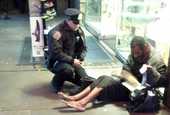 사진 속 주인공은 NYPD 소속 래리 디프리모(25) 경관. 그는 14일 타임스퀘어에서 근무를 서던 중 길가에 맨발로 앉아 있는 노숙자를 발견했다. 인근 신발매장으로 달려간 디프리모 경관은 털부츠와 보온 양말 두 켤레를 구입했다.
