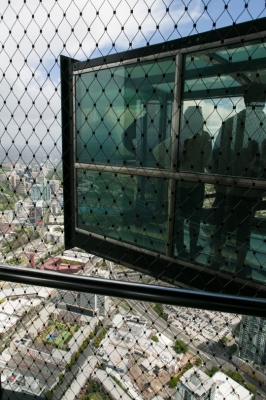 남반구 최고층 빌딩인 유레카88의 전망대에 있는 유리큐브 '디엣지'를 관광객들이 체험하고 있다.