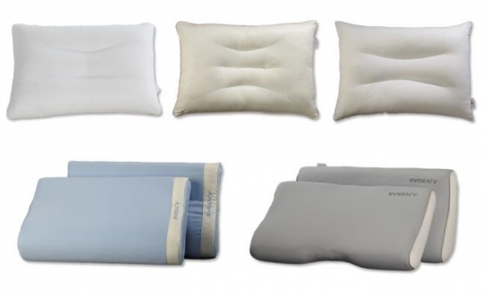 ▲ 사진 왼쪽 위부터 시계방향으로 이브자리의 스카이바이오 경추베개, 듀폰컴포맥스 경추베개, 아웃라스트 경추베개, 초극세사 메모리폼, 웨이브 메모리폼 베개.