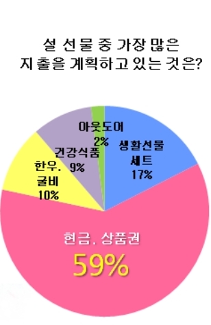 다른 조사의 경우 '설 선물로 가장 많은 지출을 계획하고 있는 상품군'으로는 '현금·상품권(1위)'이 59%로 압도적인 가운데, 올해는 특히 초저가의 '생활선물세트(17%)'가 '한우-굴비 등 식품(10%)', '건강식품(9%)' 등을 제치고 지출계획상품 2위를 차지했으며 '받고 싶은 설날 선물'에서도 2위에 올라 눈길을 끌었다.