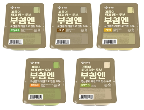 간단하게 부쳐먹을수 있는 두부도 간식용으로 출시됐다. 종가집이 내놓은 부침전용두부 '부침엔'은 카레맛, 짜장맛 등 색다른 두부맛을 즐길 수 있다. 계란으로 응고해 쉽게 부서지지 않아 부쳐먹거나 볶음밥에 넣어 먹으면 된다.